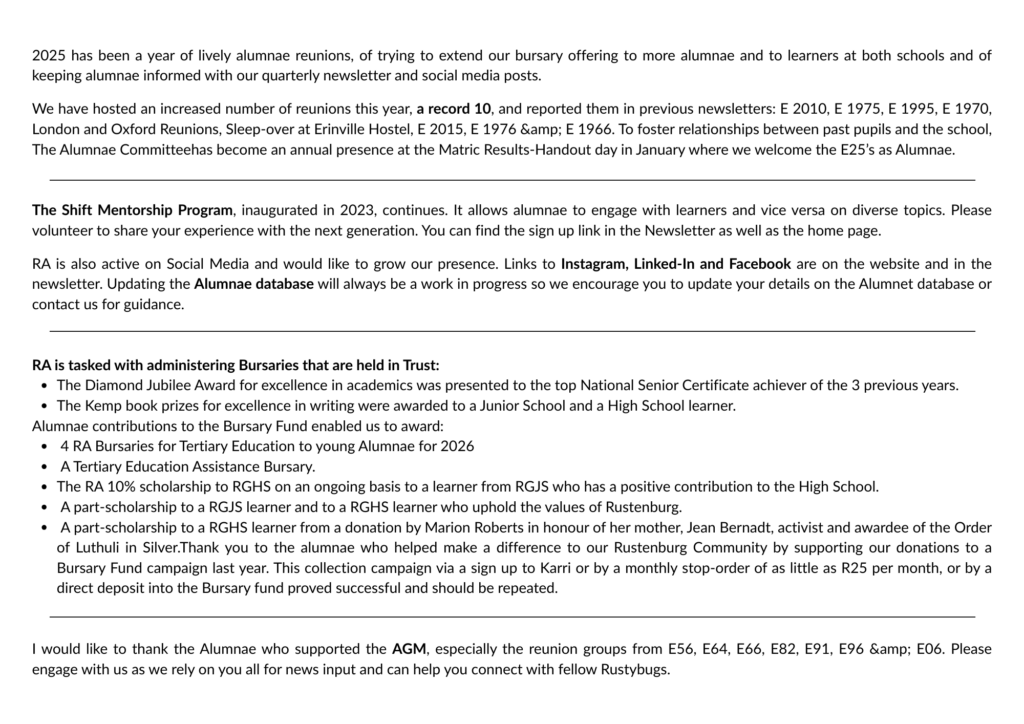 Welcome to the Rustenburg Alumnae Association! Our mission is to connect past pupils, support our schools, and administer bursaries. We aim to: